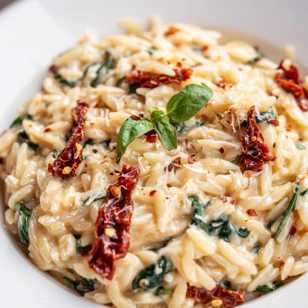 This satisfying one-skillet orzo dish brings together tender rice-shaped pasta with sun-dried tomatoes, fresh spinach, and a velvety Parmesan cream sauce. The Tuscan-inspired flavors of garlic, thyme, and a hint of chili create a beautifully balanced 30-minute meal that's perfect for weeknight dinners or casual entertaining.