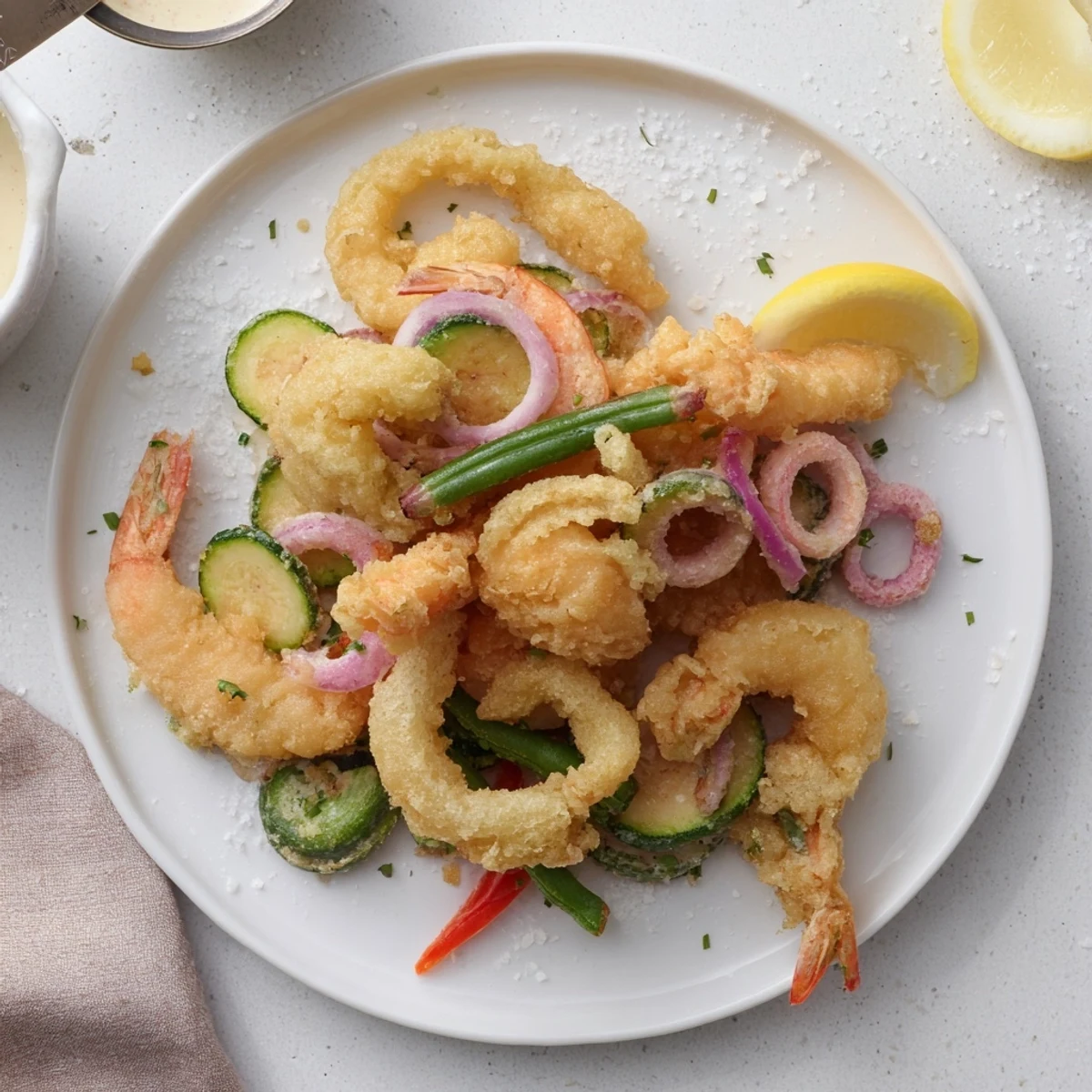 Golden, airy batter made with ice-cold sparkling water yields a light, crisp coating for peeled shrimp, zucchini, bell pepper, green beans and optional baby squid. Maintain oil at 180°C and fry in small batches for 2–3 minutes until uniformly crisp. Drain on paper towels, garnish with lemon and parsley, and offer aioli or marinara for dipping. Swap vegetables as desired.