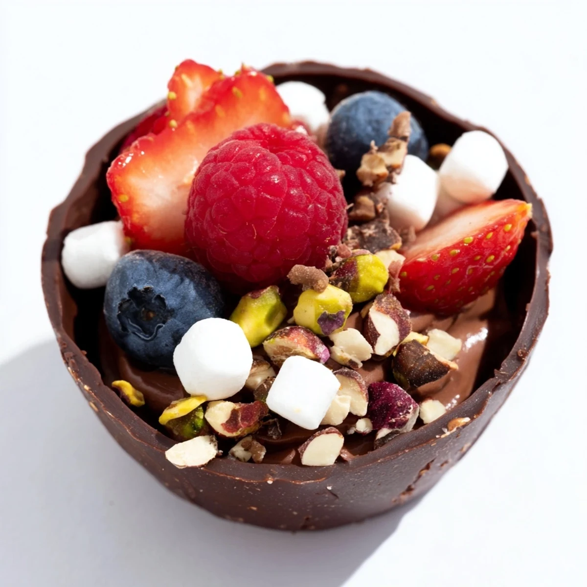Fresh raspberries, sliced strawberries, blueberries, shredded coconut, crushed cookies, pretzel pieces, caramel drizzle, sea salt flakes, or fresh mint leaves all complement the rich chocolate. Choose toppings that provide color contrast and varied textures.