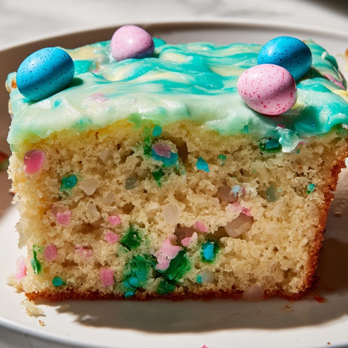 This tender vanilla cake features crushed candy-coated robin eggs folded throughout the batter, creating colorful speckles and a satisfying crunch in every bite. The playful pastel glaze adds sweetness and visual appeal, while the cake itself remains moist and tender thanks to buttermilk in the batter. Perfect for spring celebrations, Easter dessert tables, or whenever you want something whimsical and sweet.