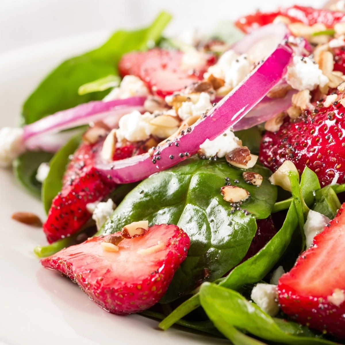 This vibrant dish brings together the sweetness of fresh strawberries with tender baby spinach, all tied together with a homemade tangy balsamic poppy seed dressing. The combination of creamy feta, crunchy toasted almonds, and crisp red onion creates perfect texture balance.